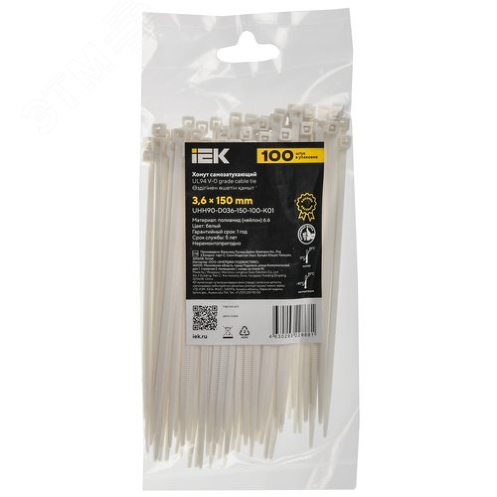 • Хомут P6.6 самозатухающий белый 3.6х150мм 100шт/упак IEK
