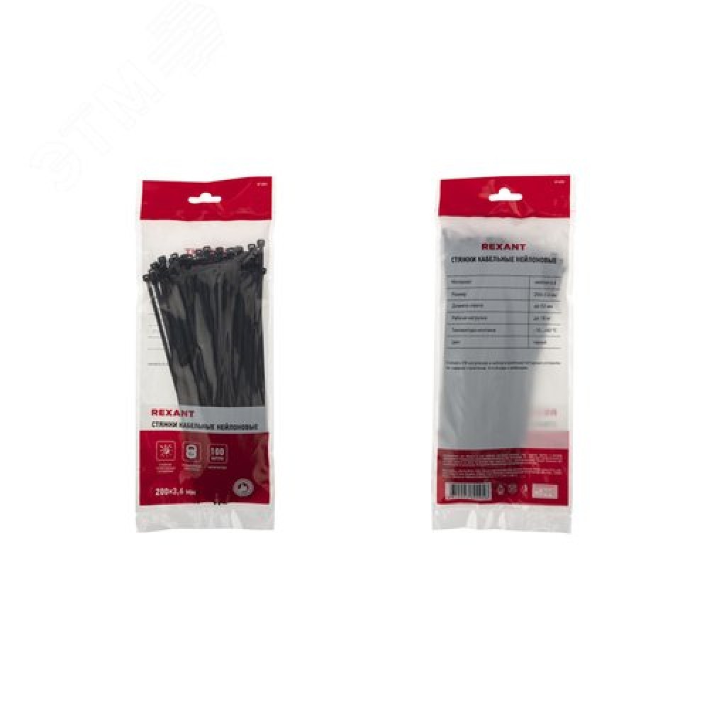 Технические характеристики Хомут-стяжка кабельная нейлоновая 200x3,6 мм, черная, упаковка 100 шт, REXANT