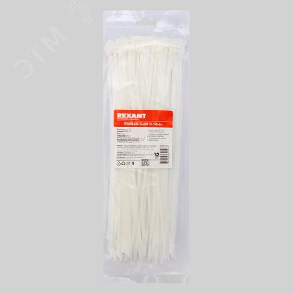 Технические характеристики Хомут-стяжка кабельная нейлоновая 300x3,6 мм, белая, упаковка 100 шт, REXANT