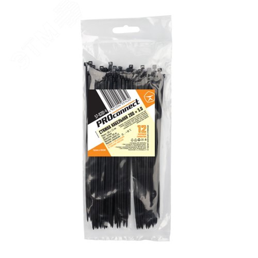 Технические характеристики Хомут-стяжка кабельная нейлоновая PROconnect 200x2,5 мм, черная, 100 шт