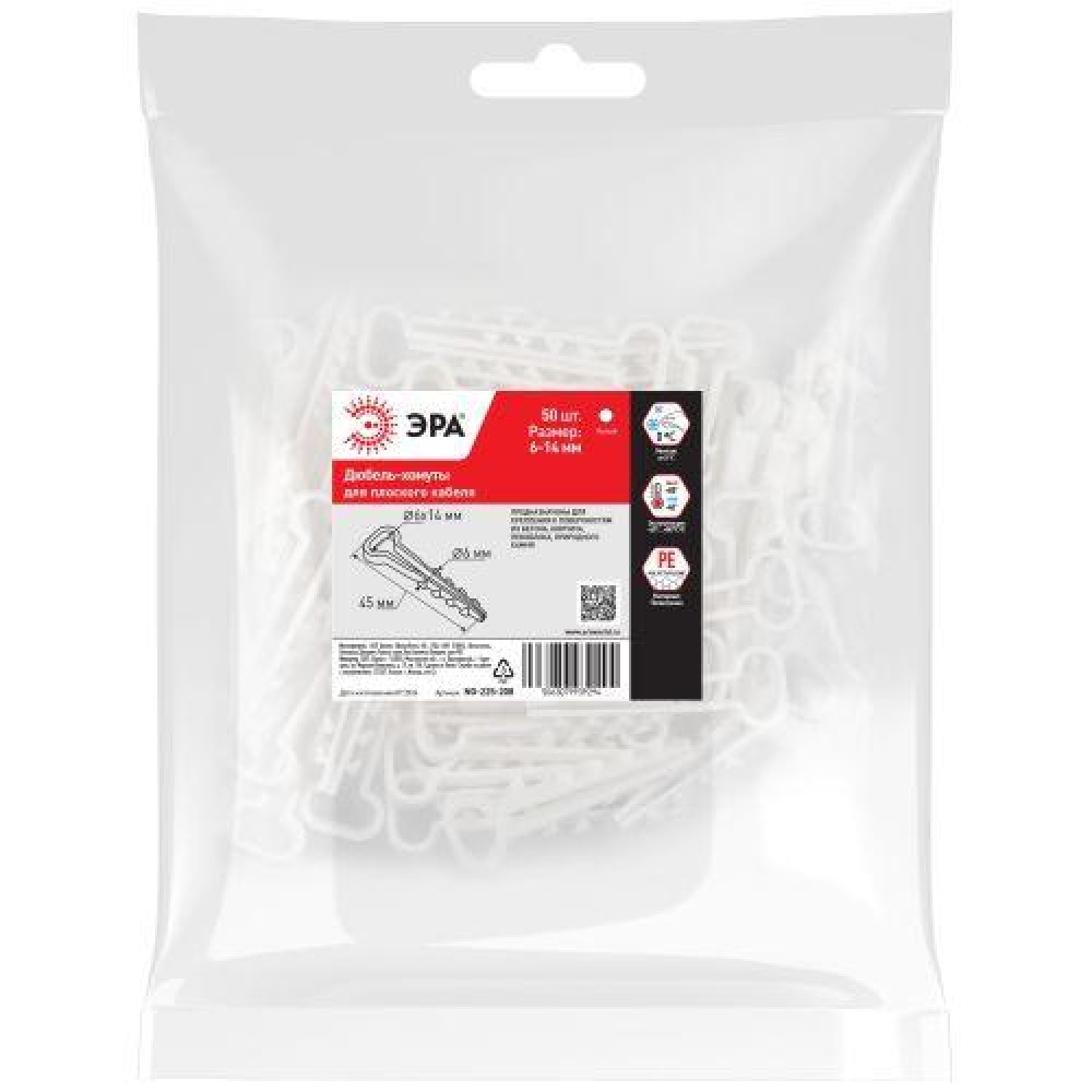 Технические характеристики Дюбель-хомут 6-14мм для плоского кабеля NO-225-208 бел. (уп.50шт) Эра Б0066268