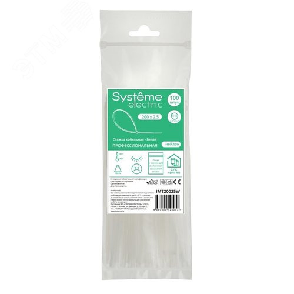 Технические характеристики Стяжка кабельная MultiSet 200х2.5 Белая (100шт)