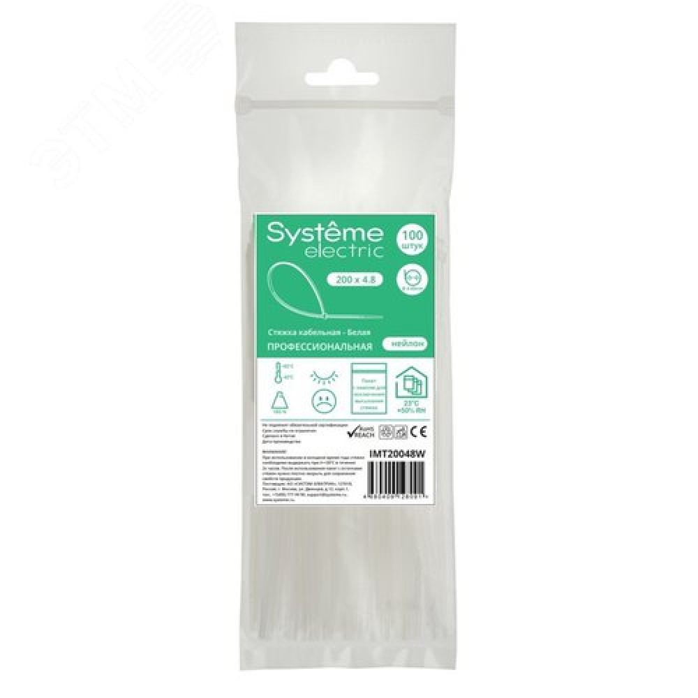 Технические характеристики Стяжка кабельная MultiSet 200х4.8 Белая (100шт)