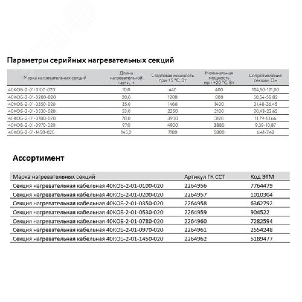 Технические характеристики Кабель нагревательный резистивный 40КОБ-2-01-1450-020 (под бетон) секция 145 м