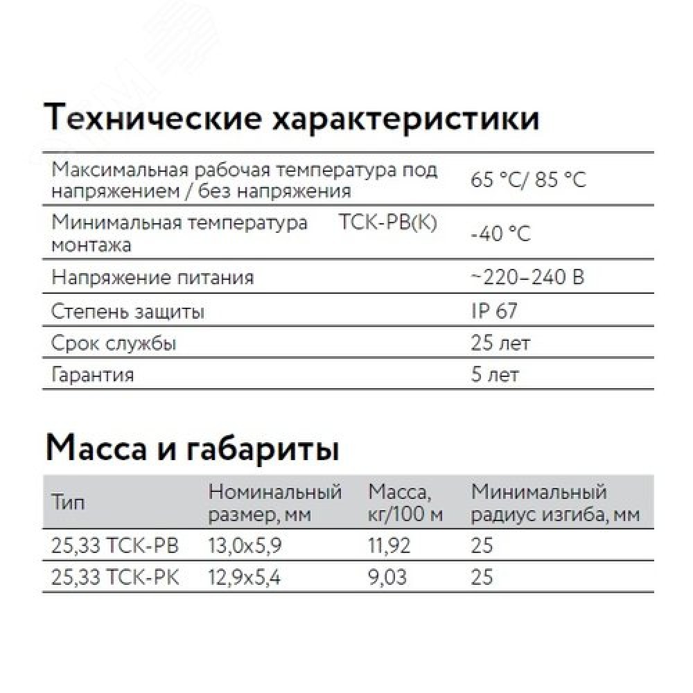 Технические характеристики Кабель нагревательный саморегулирующийся 33ТСК-РВ