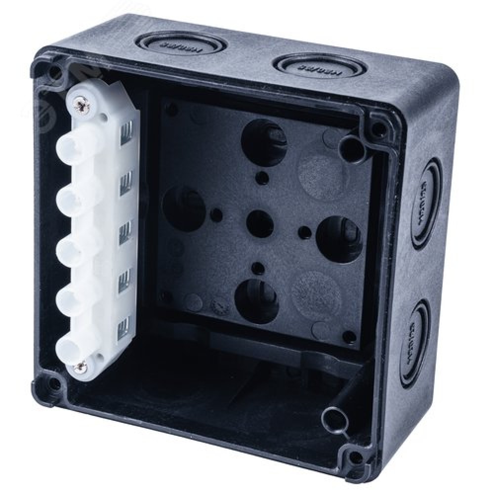 Технические характеристики Коробка распределительная 110*110*67 мм IP 65, черная, в комплекте с клеммным рядом 5х6 кв.мм, 41А