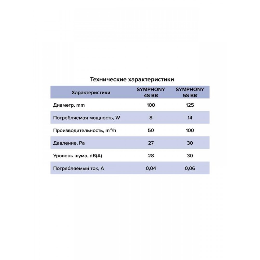 Технические характеристики Вентилятор осевой встраив. SYMPHONY D125 сетка двигатель BB ERA SYMPHONY 5S BB
