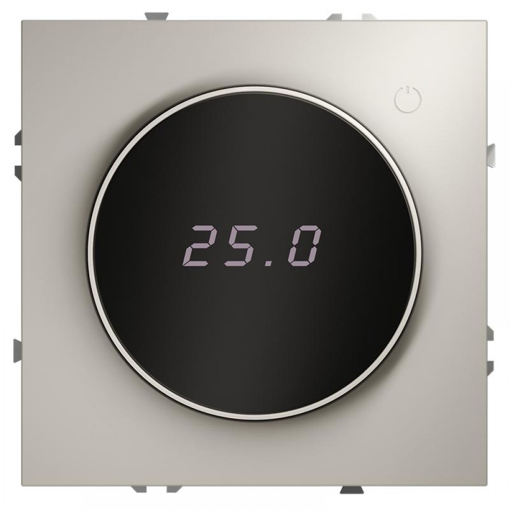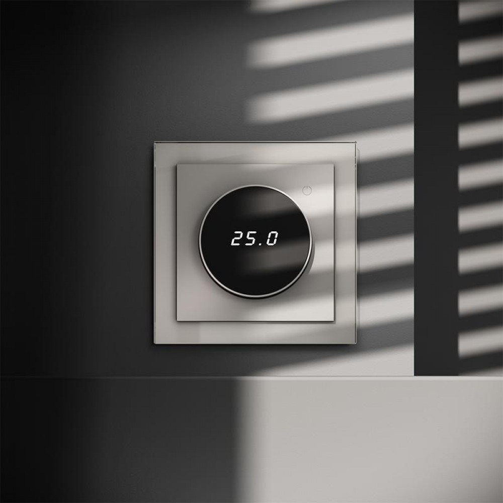 Место установки. Терморегуляторы Voltum предназначены для регулирования температуры теплого пола. Актуальны как в городских квартирах, так и в загородных дачных домах без центрального отопления. Корпус. Дизайн терморегуляторов Voltum сочетается со стилем остальных электрических устройств компании. Они совместимы со всеми рамками. Материал внешних декоративных элементов — поликарбонат. Конструктивные особенности. Терморегуляторы работают с любыми типами теплых полов и рассчитаны на нагрузку до 3500 Вт. Устройства оснащены светодиодной индикацией режима и дисплеем, на котором отображается температура поверхности пола. Красный индикатор — «подача питания на нагревательный кабель (идет процесс нагрева)», отсутствие индикации — «заданная температура достигнута». В течение 15 минут после нагрева терморегулятор переходит в интеллектуальный «спящий режим», уменьшая яркость подсветки цифр и сокращая энергопотребление. Регулировка осуществляется вращением панели управления. Терморегулятор поставляется в комплекте с механизмом из пластиковой накладки и датчиком температуры.