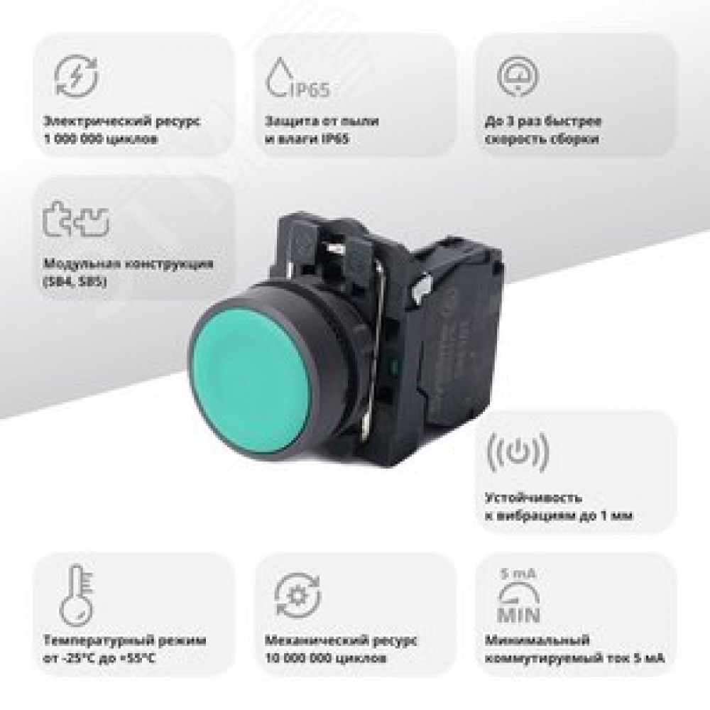 Технические характеристики Кнопка SB5 в сборе модульная 22мм зеленая с возвратом пластик 1НО