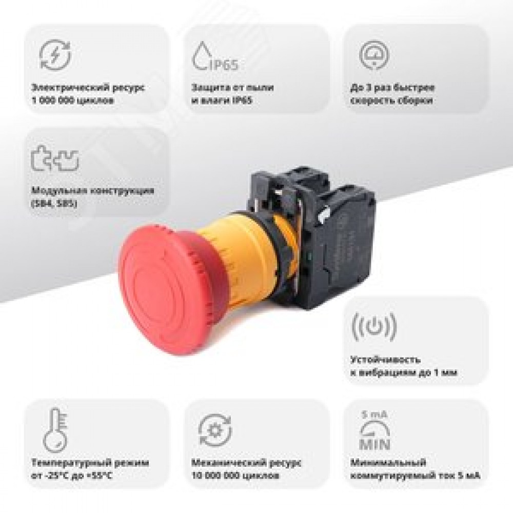 Технические характеристики Кнопка аварийн ост SB5 в сборе 22мм 40мм повернуть для возврат пластик 1НО+1НЗ