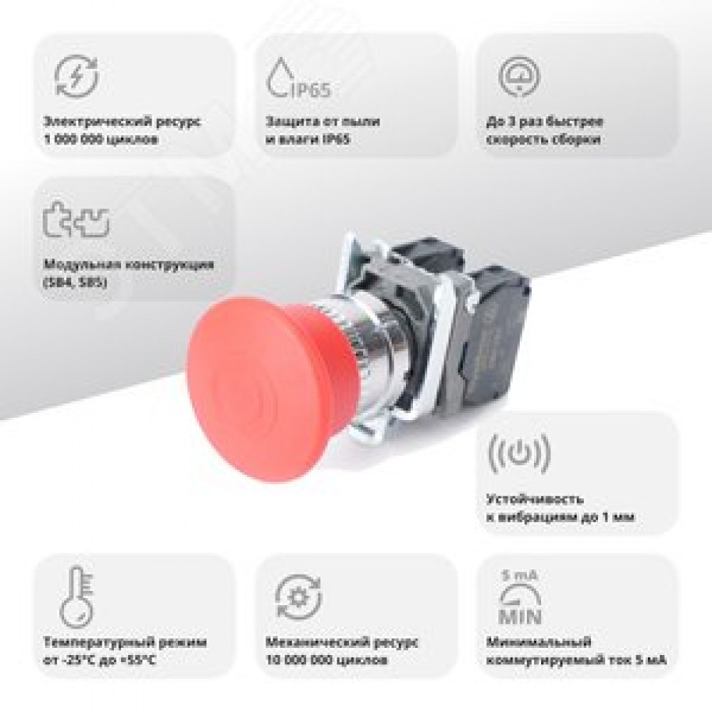 Технические характеристики Кнопка аварийного останова SB4 в сборе 22мм 40мм тяни-толкай металл 1НО+1НЗ