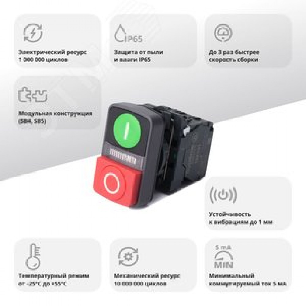 Технические характеристики Кнопка двойн SB5 в сборе модуль 22мм pI+сиг ламп+кр выстО пластик 230ВАС 1НО+1НЗ