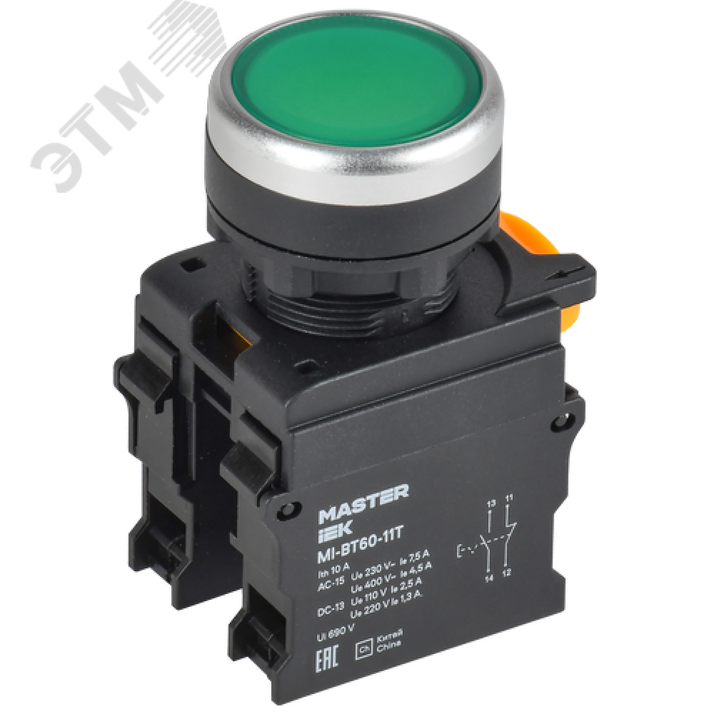 Технические характеристики Кнопка с фиксацией d=22мм 1NO+1NC зелёная MASTER
