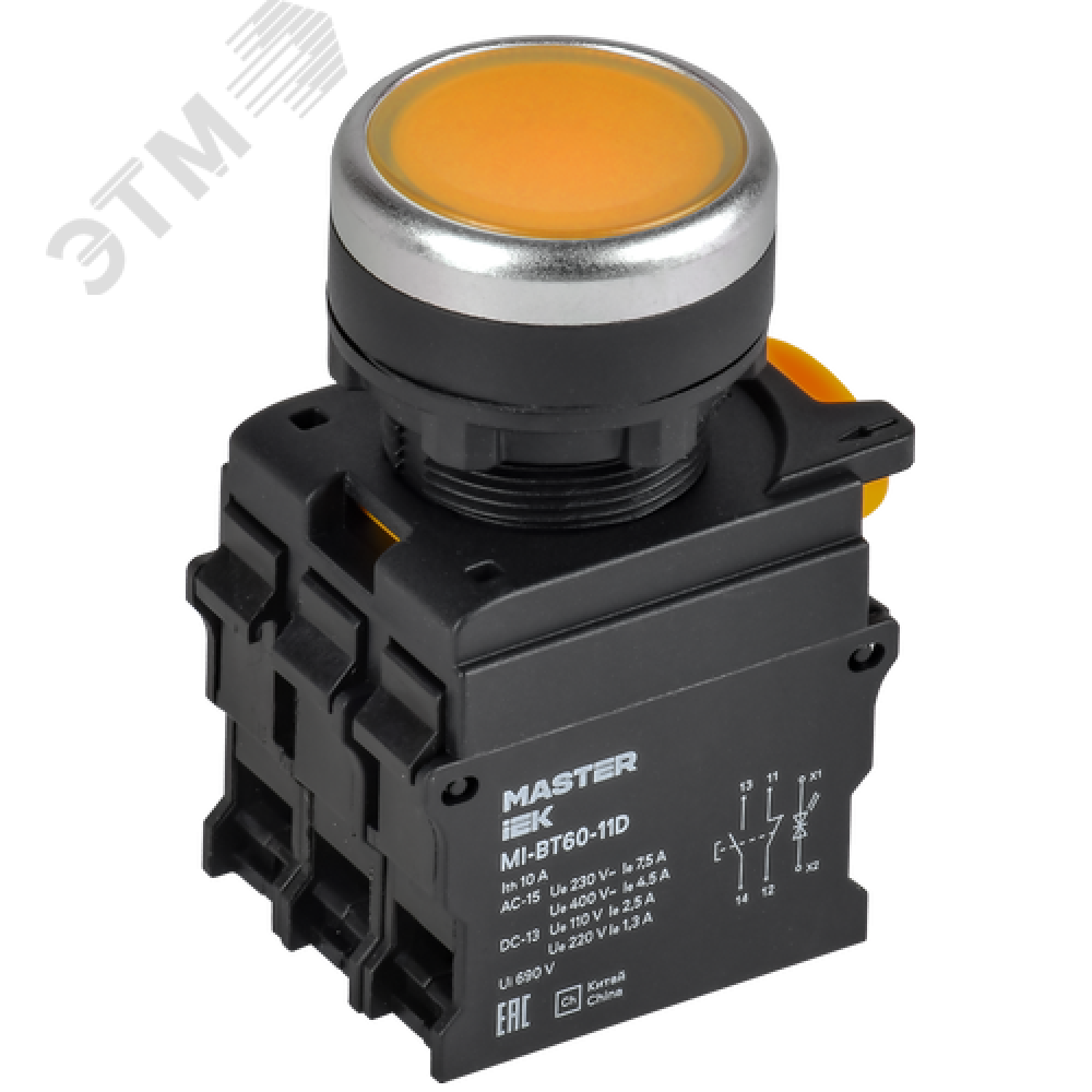 Технические характеристики Кнопка с подсветкой d=22мм 1NO+1NC жёлтая MASTER