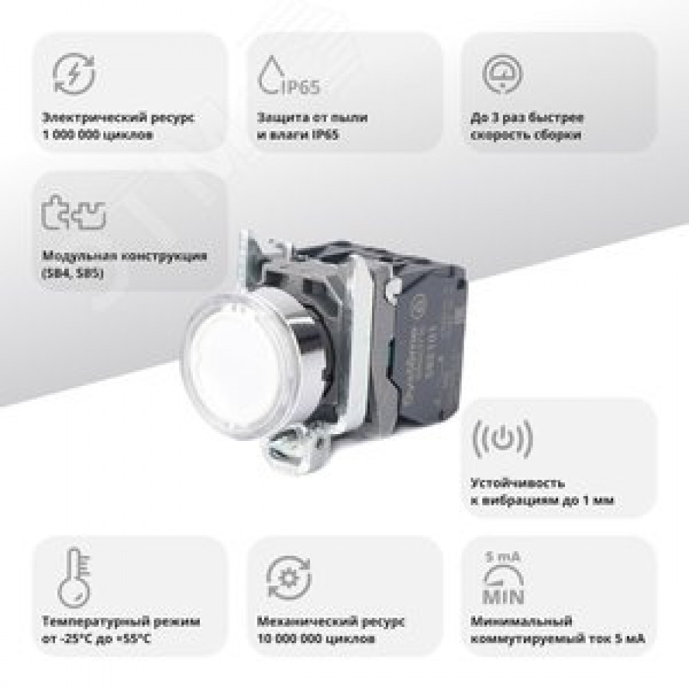 Технические характеристики Кнопка SB4 с подсветкой в сборе модульная 22мм белая металл 24ВDC 1НО+1НЗ