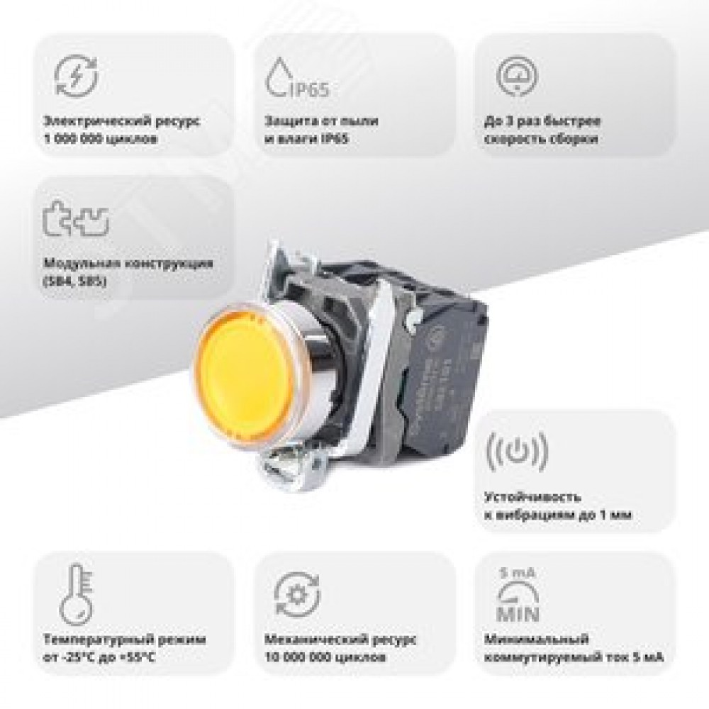Технические характеристики Кнопка SB4 с подсветкой в сборе модульная 22мм желтая металл 24ВDC 1НО+1НЗ