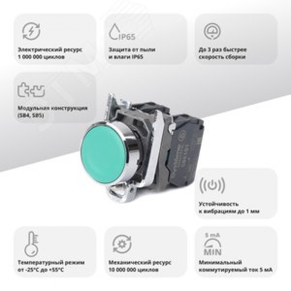 Технические характеристики Кнопка SB4 в сборе модульная 22мм зеленая с возвратом металл 1НО+1НЗ
