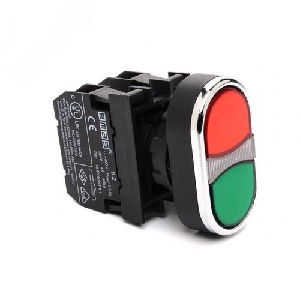 Технические характеристики Кнопка сдвоенная 1НО+1НЗ, красный + зелёный цвет ,серия B,250В AC, 4А, IP50
