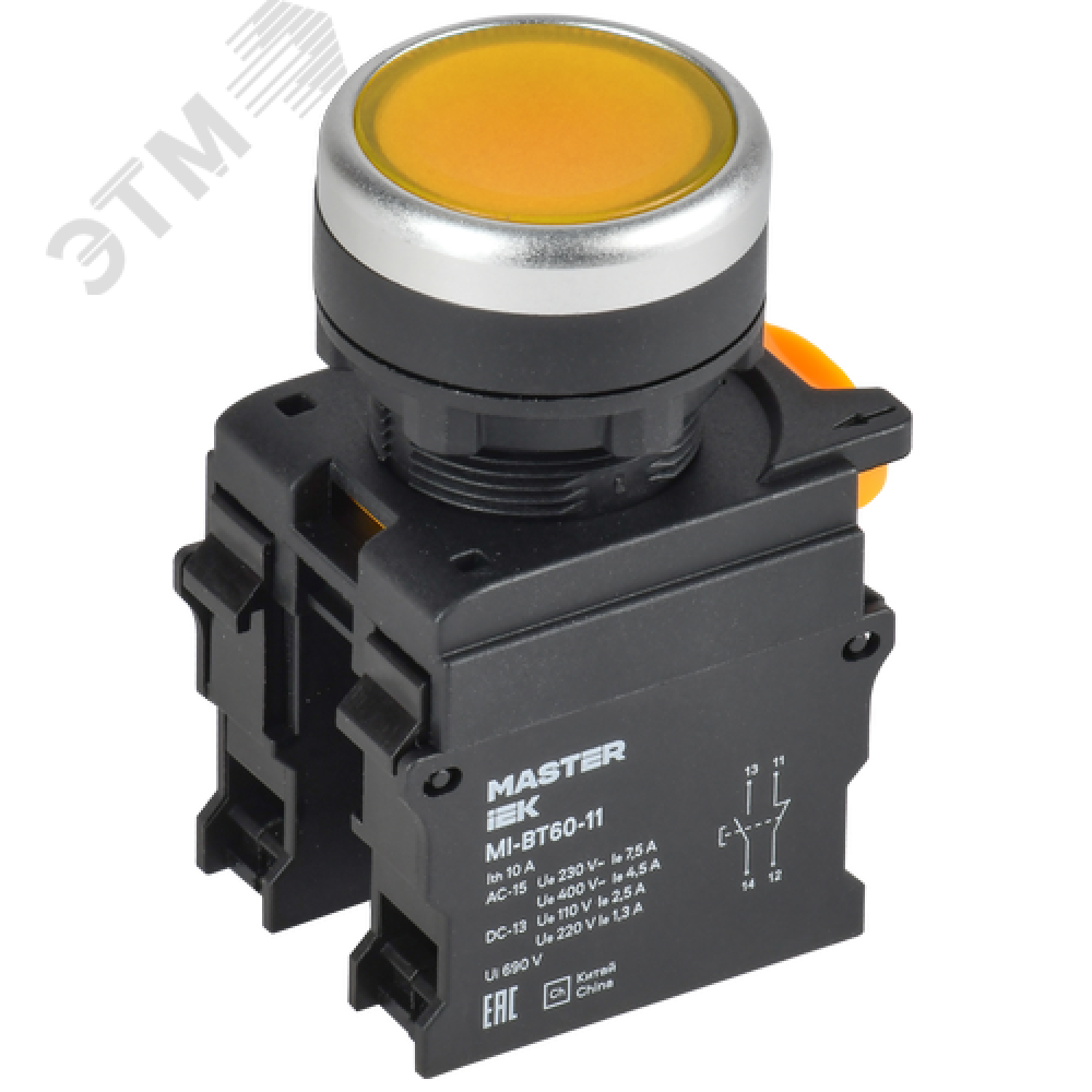 Кнопка d=22мм 1NO+1NC жёлтая MASTER