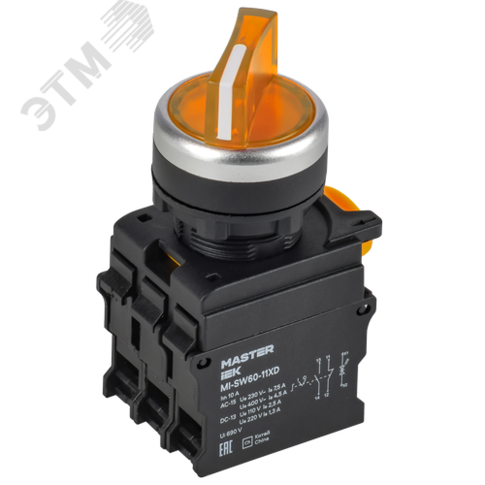 Технические характеристики Переключатель с подсв. 2 полож. 1NO+1NC жёлтый MASTER