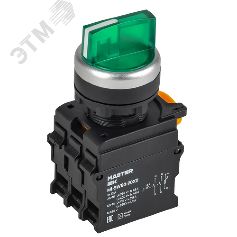 Технические характеристики Переключатель с подсветкой 3 полож. 2NO зеленый MASTER