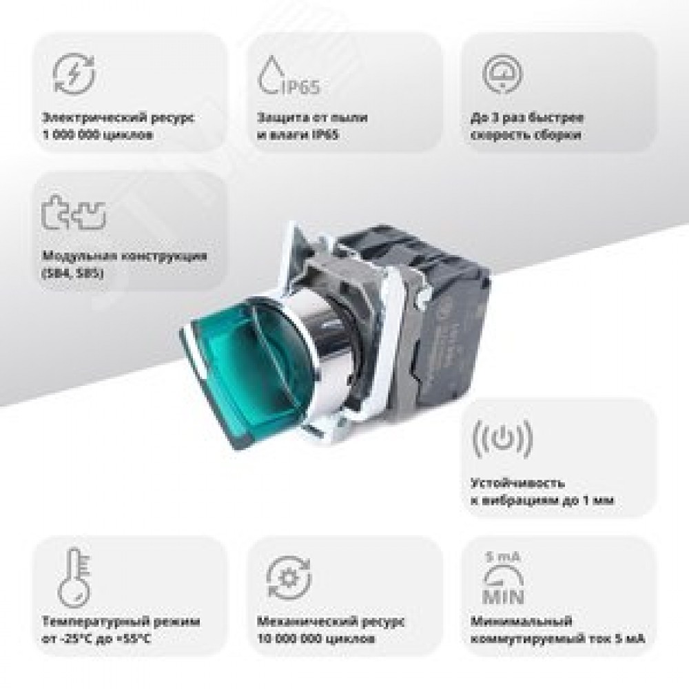 Технические характеристики Переключатель SB4 с подсвет в сборе 22мм 2поз зел сфикс металл 24В DC 1НО+1НЗ