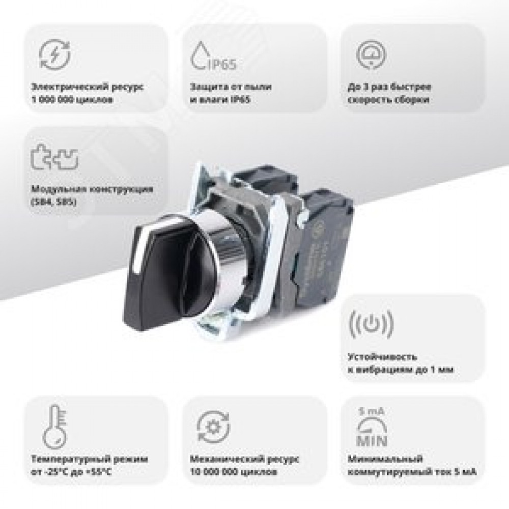 Технические характеристики Переключатель SB4 в сборе модульный 22мм 3 позиции с фиксацией 2НО