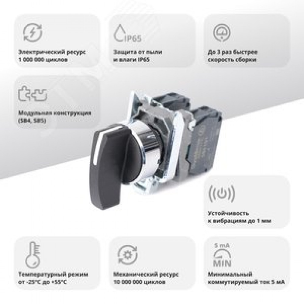 Технические характеристики Переключатель SB4 в сборе модульный 22мм 3 позиции с фиксацией ручка 2НО
