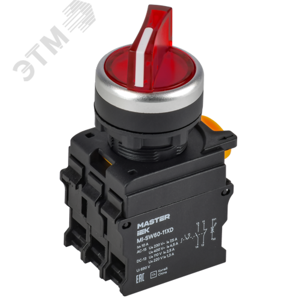 Технические характеристики Переключатель с подсв. 2 полож. 1NO+1NC красный MASTER