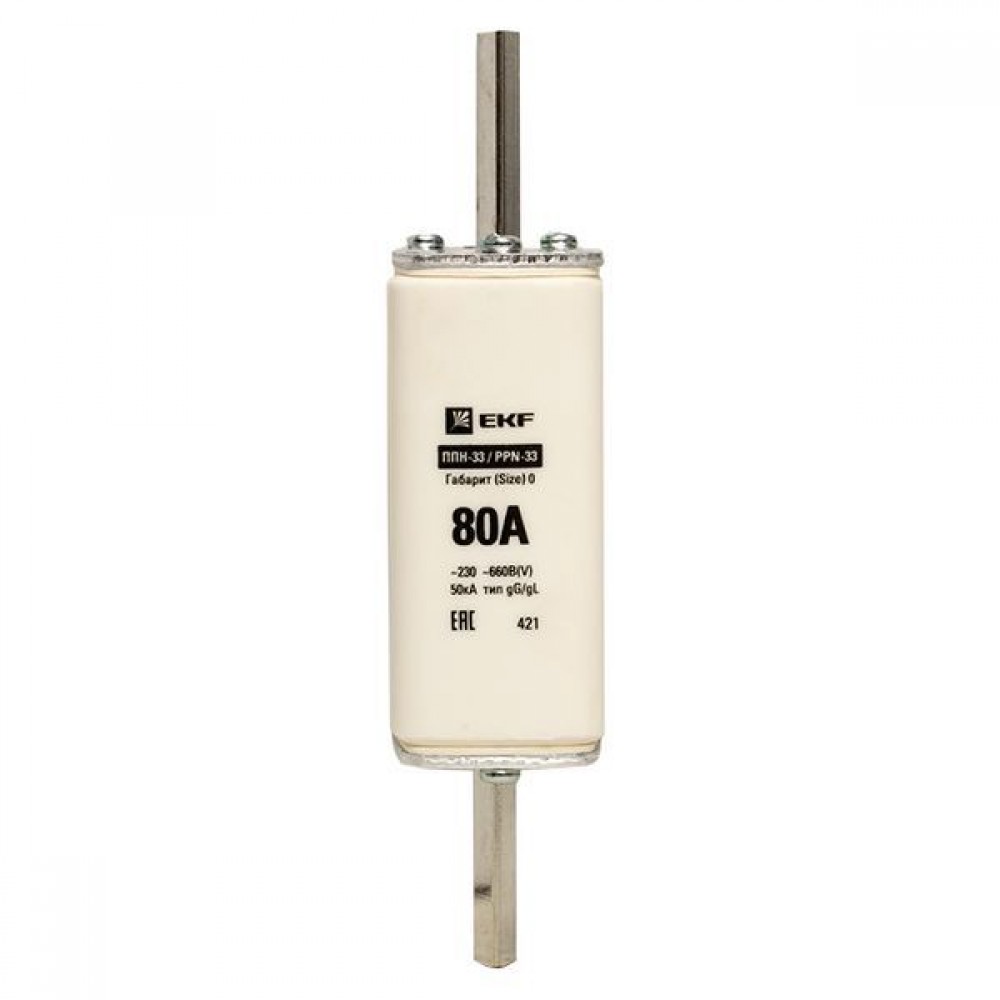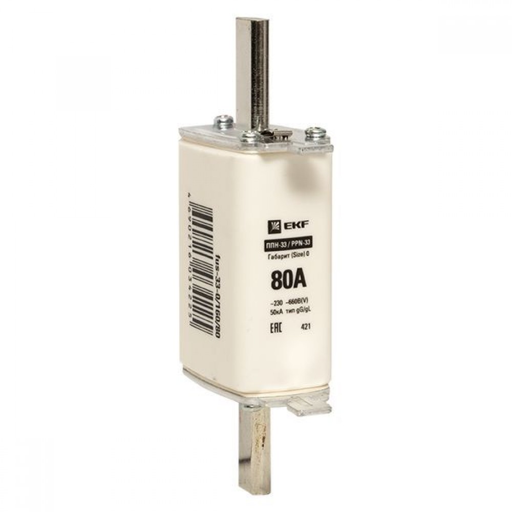 Плавкая вставка ППН-33 160/ 80А габарит 0 EKF. Предохранители плавкие ППН EKF, укомплектованные плавкими вставками типа gG/gL, предназначаются для защиты кабельных линий и промышленных электроустановок от токов перегрузки и короткого замыкания. Предохранители применяются в электрических сетях переменного тока частотой 50 Гц с напряжением до 660В. Применяются для крепления в распределительных и вводно-распределительных устройствах. Предохранители плавкие ППН могут устанавливаться в основание с держателем, а также в специально предназначенные рубильники. В комплект поставки предохранителей плавких ППН основание с держателем не входит и приобретается отдельно.
