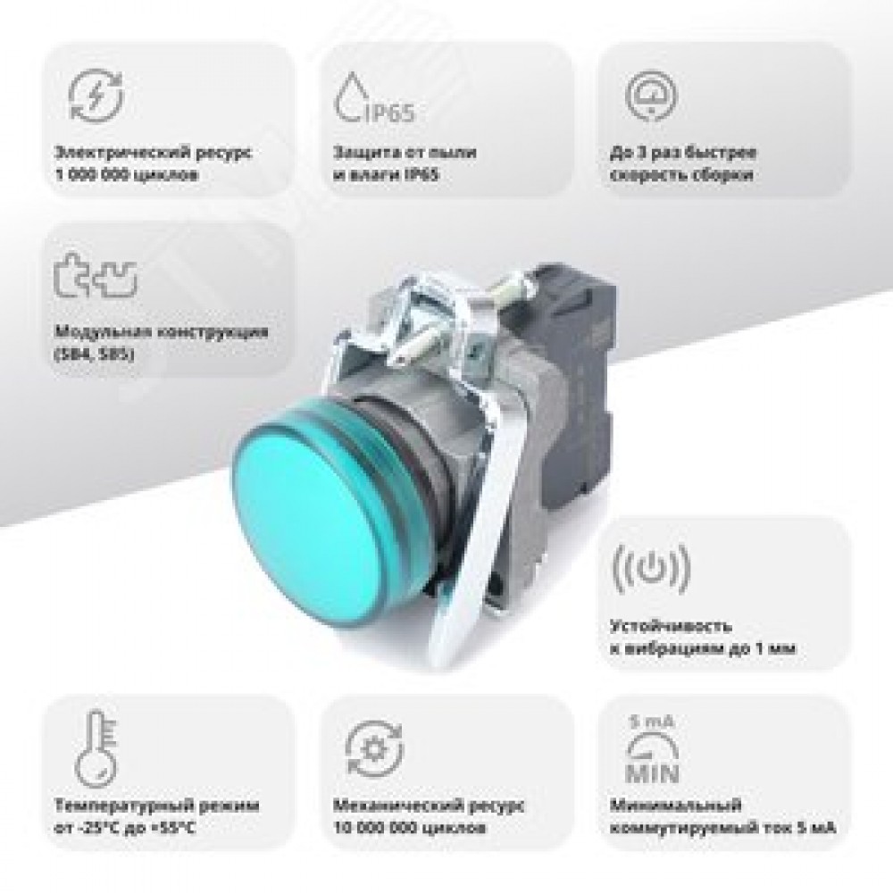 Технические характеристики Лампа сигнальная в сборе модульная 22 мм зеленая 24В DC