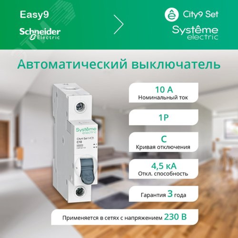 Технические характеристики Выключатель автоматический однополюсный 10А С 4.5kA 230В City9 Set