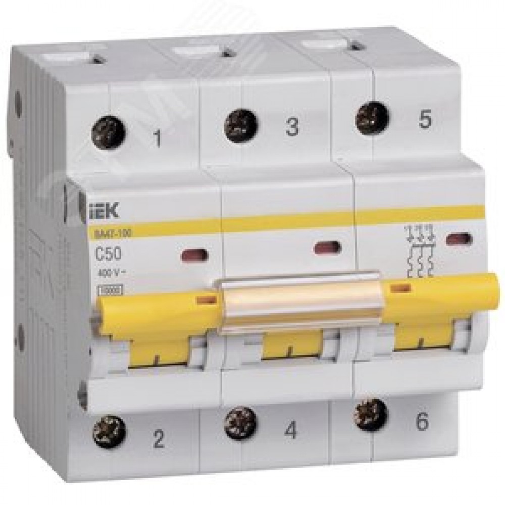Технические характеристики Выключатель автоматический трехполюсный 50А С ВА47-100 10кА