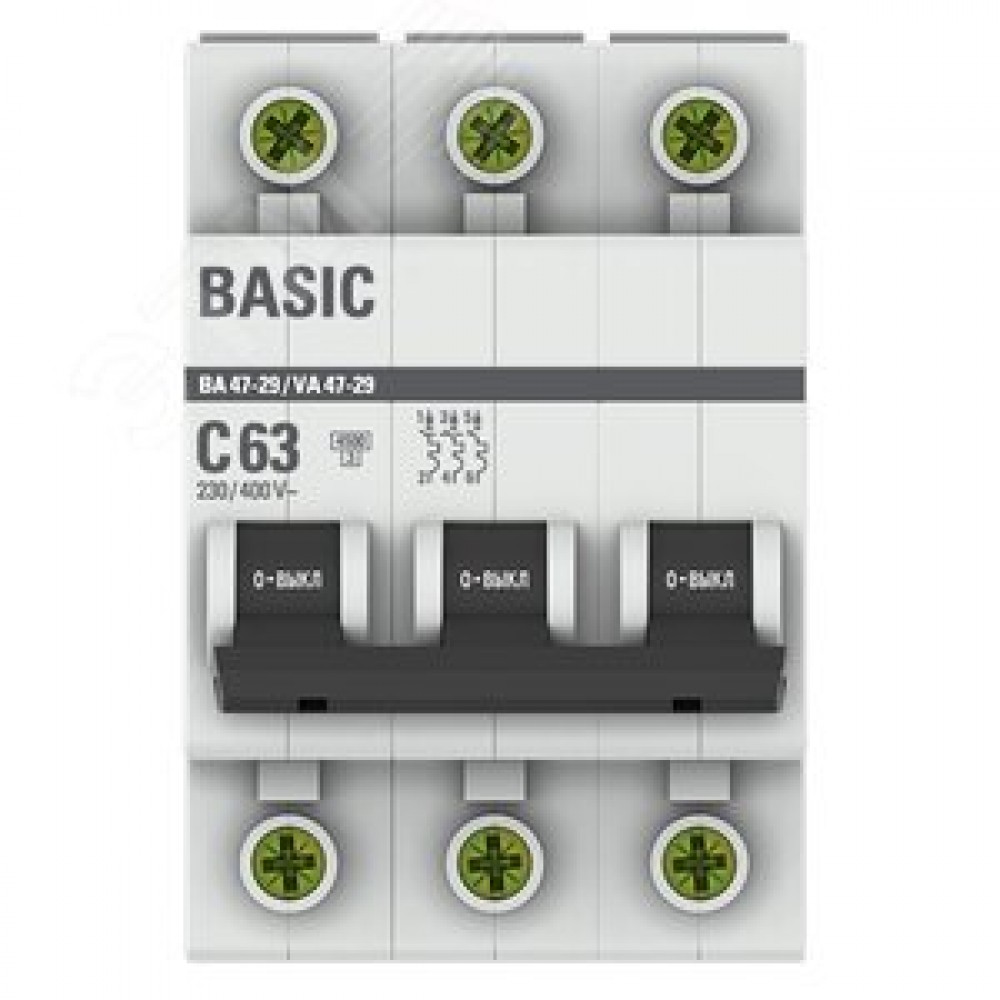 | Комплектация | автоматический выключатель ВА 47-29 3P 63А (C) 4,5кА BASIC |