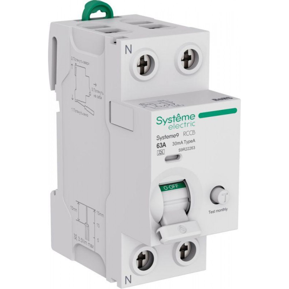 Выключатель дифференциального тока (ВДТ) или устройство защитного отключения (УЗО) S9R, серии Systeme9, Systeme Electric, 2-полюсный, номинальный ток 63 А, ток утечки = 30 мА, тип A. Соответствует требованиям стандартов ГОСТ IEC 61008-1 и ГОСТ IEC 60947-2. Применяется в электрических сетях напряжением 230 В. Предназначен для защиты людей от токов утечки при прямом (10 и 30мА) и косвенном (100мА) прикосновении к токоведущим частям, а также для защиты электроустановок от возгорания (300мА). Принцип действия - электромеханический. Нейтраль слева. Оснащен двойными безопасными клеммами раздельного монтажа проводников, механизмом мгновенной коммутации, индикатором состояния контактной группы и срабатывания по причине возникновения тока утечки. Монтируется на DIN-рейку при помощи двухпозиционных защёлок, с возможностью демонтажа без снятия шины PIN.