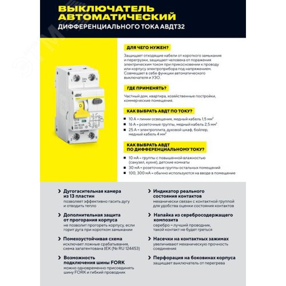 Технические характеристики Автоматический выключатель дифференциального тока АВДТ-32 1п+N 6А 30мА С(Электронный)