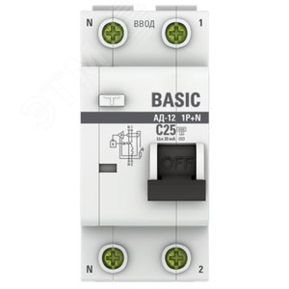 | Комплектация | АВДТ АД-12 1P+N 25А 30мА тип АС х-ка C эл. 4,5кА Basic |