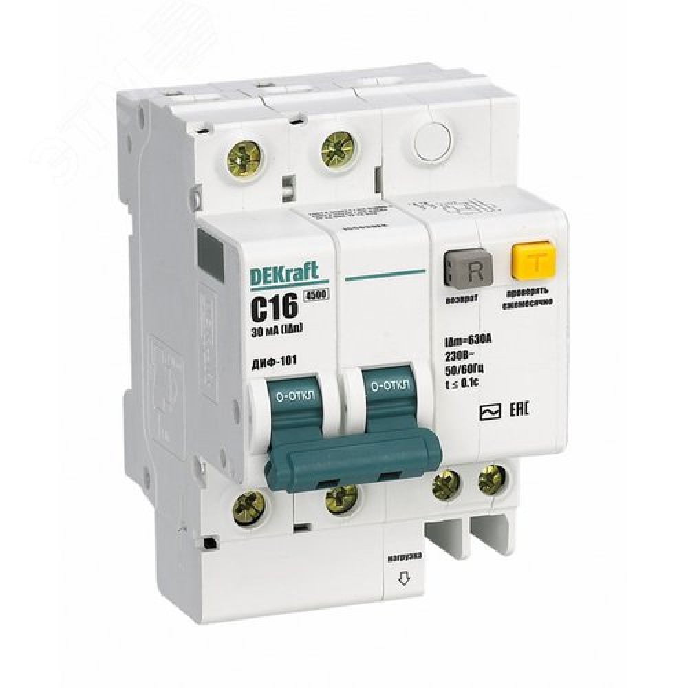 Технические характеристики Выключатель автоматический дифференциальный (Автоматический выключатель дифференциального тока АВДТ) 2п 16А 30мА тип AC С 4.5кА ДИФ-101