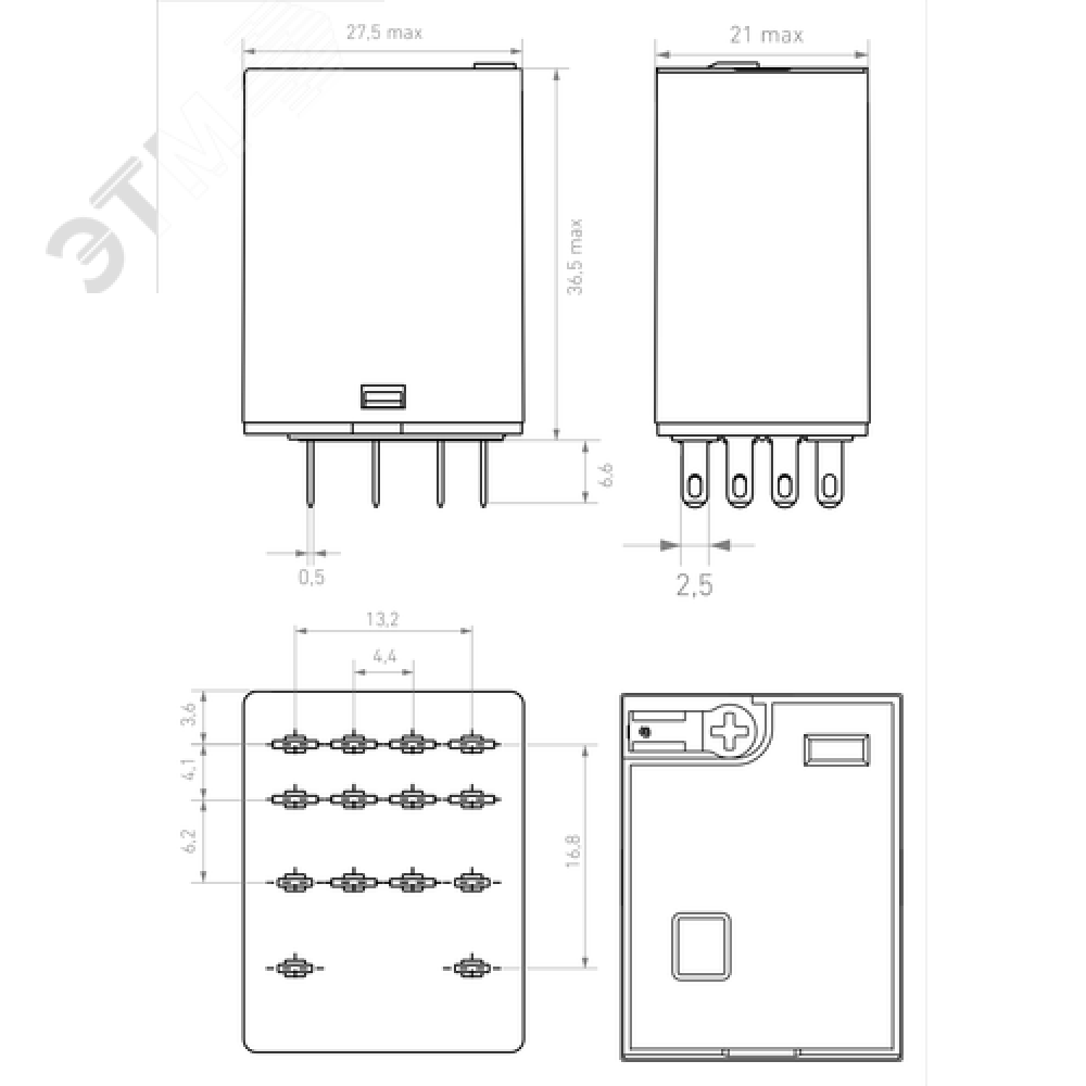 Технические характеристики Промежуточное реле, 4 перекидных контакта 6А, 220В (DC), блокируемая кнопка проверки, светодиод