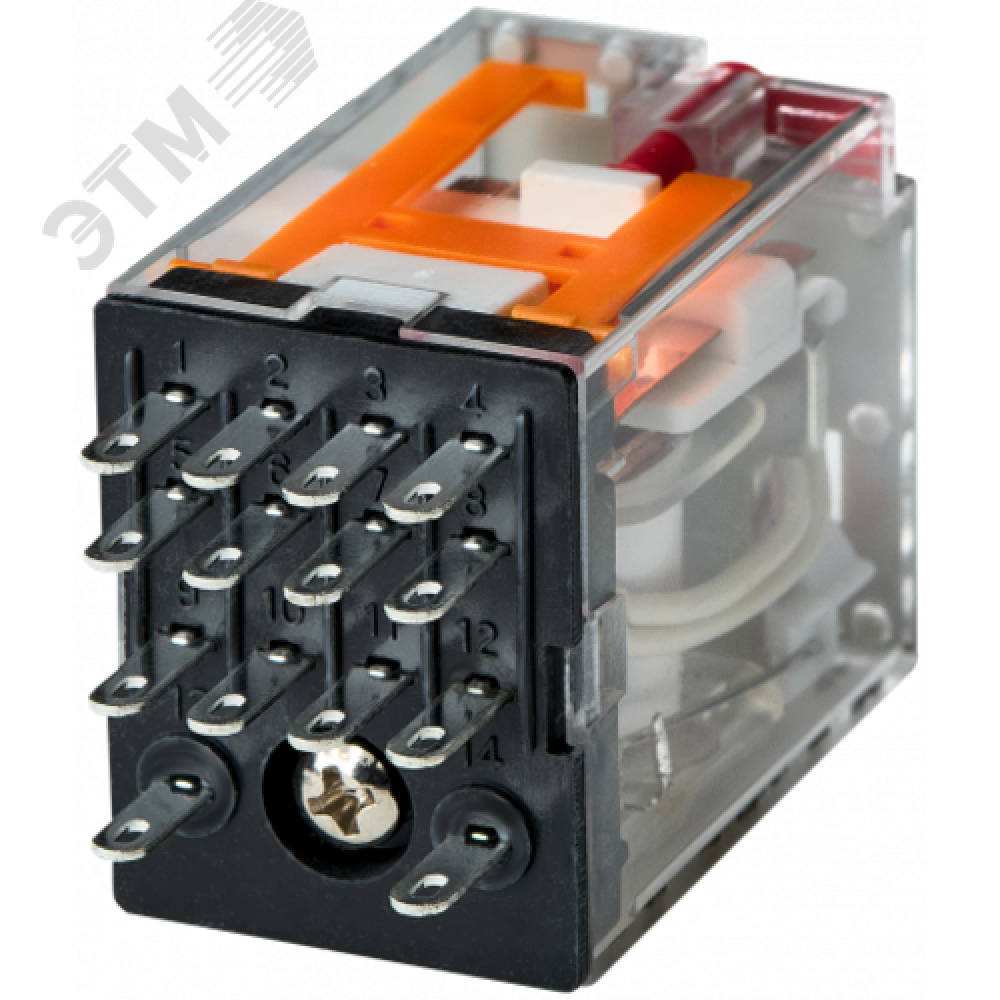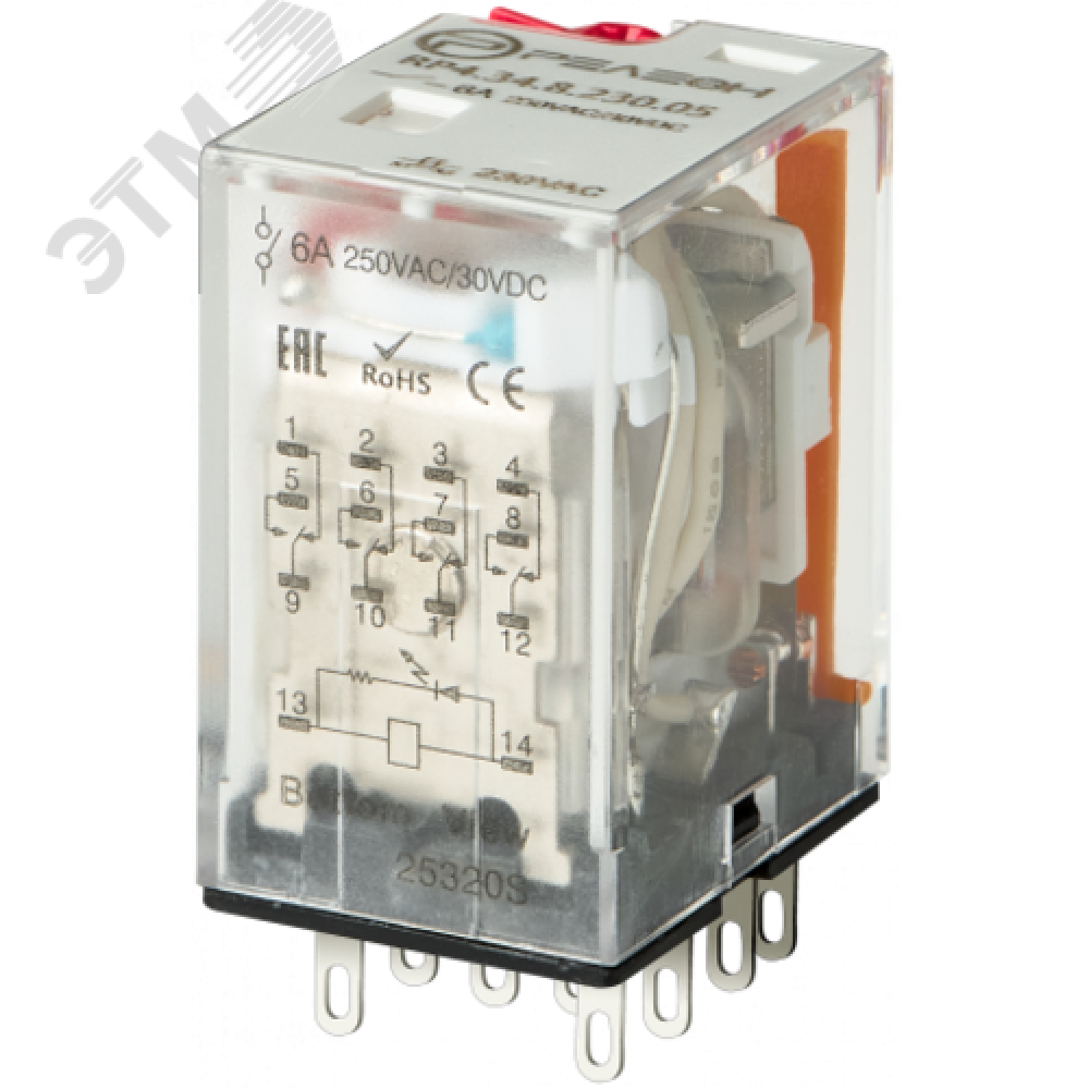 Реле промежуточное, 4 перекидных контакта 6А 230В AC блокируемая кнопка проверки, светодиод