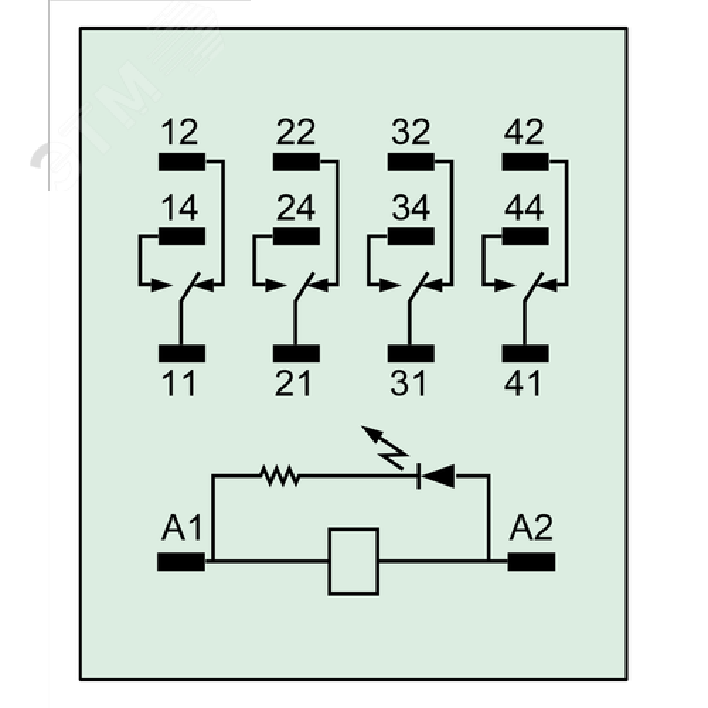 Технические характеристики Реле промежуточное, 4 перекидных контакта 6А 230В AC блокируемая кнопка проверки, светодиод