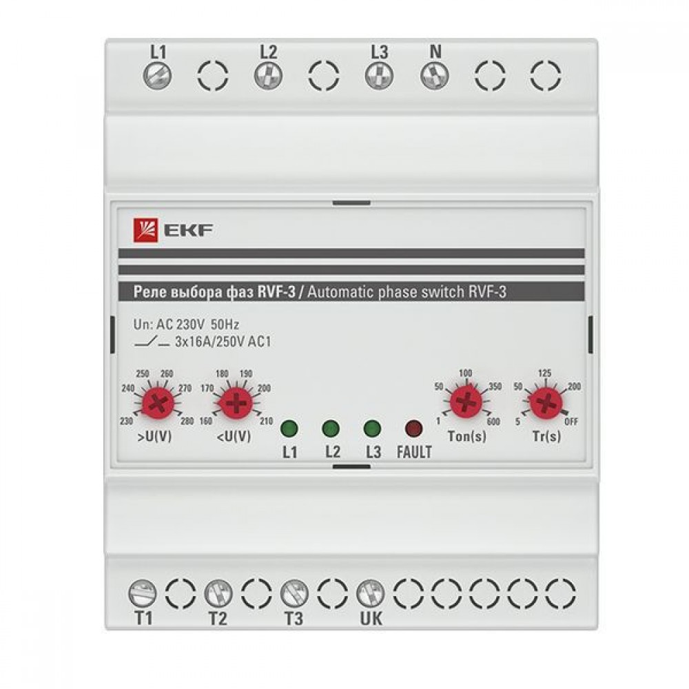 Реле выбора фаз RVF-3 EKF PROxima используется для питания однофазной нагрузки 230В/50(60) Гц от трехфазной четырехпроводной (пятипроводной) сети. Реле переключает питание однофазного потребителя в зависимости от наличия и качества фазного напряжения на проводниках L1, L2 и L3. Наиболее приоритетным является питание нагрузки от фазного проводника L1 менее приоритетным от L3, при нормальных параметрах напряжения на всех фазах, реле подключит нагрузку от приоритетной фазы (L1). Если на приоритетной фазе значение напряжения выходит за пределы порогов срабатывания, то прибор переключает нагрузку на другую фазу. Если напряжение на резервных фазах не соответствует выставленным порогам срабатывания, то нагрузка отключается