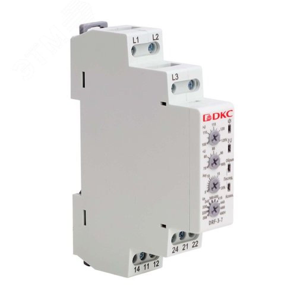 • Реле контроля фаз, 3 фазы + N, тип DRF, контроль напряжения , контроль обрыва фаз, котроль чередования фаз, контроль асимметрии, конфигурация контакта 2CO, 120-277В