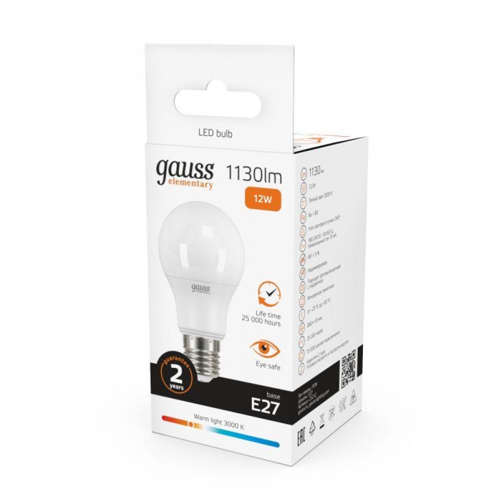 Технические характеристики Лампа светодиодная Elementary 12Вт A60 грушевидная 3000К тепл. бел. E27 1130лм GAUSS 23212