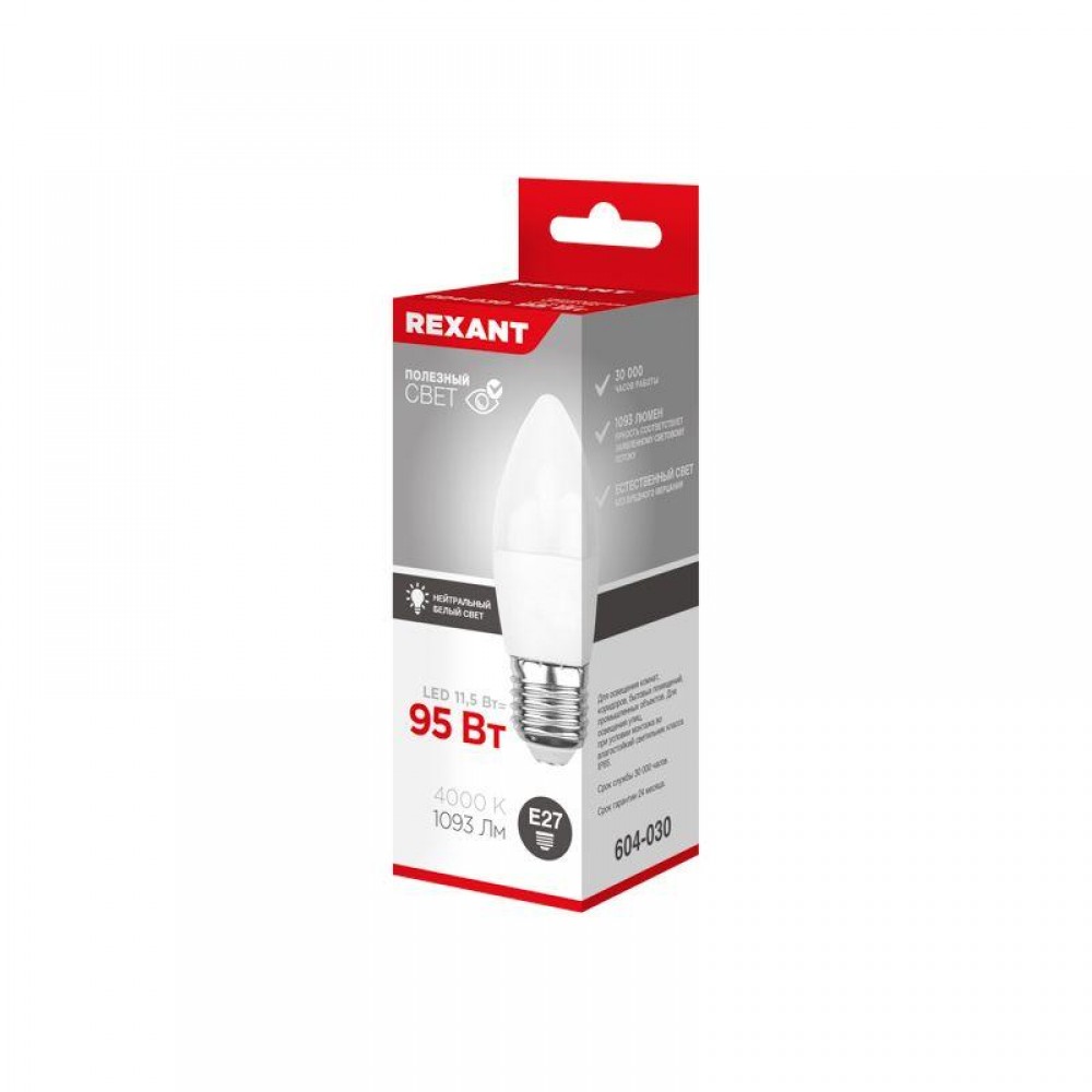 Технические характеристики Лампа светодиодная 11.5Вт CN свеча 4000К нейтр. бел. E27 1093лм Rexant 604-030