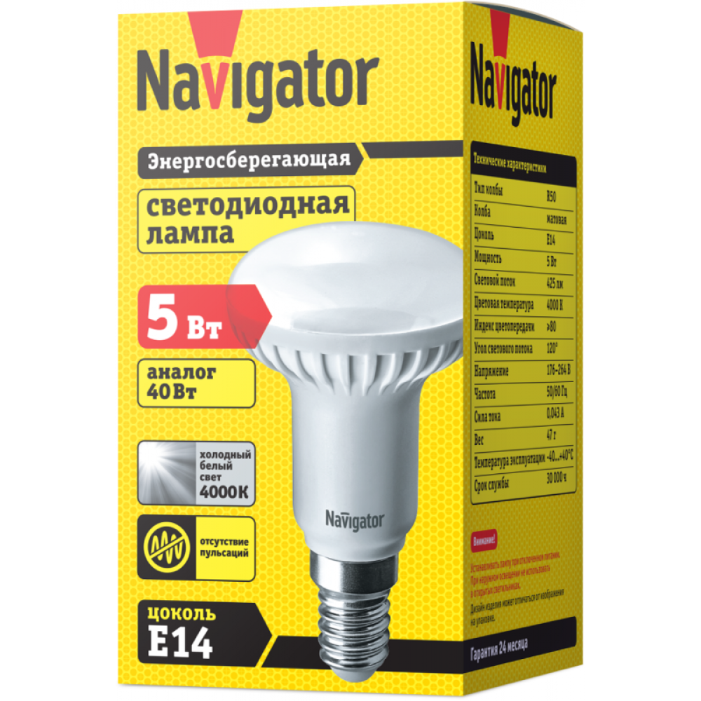 Технические характеристики Лампа светодиодная 94 136 NLL-R50-5-230-4K-E14 5Вт 4000К нейтр. бел. E14 425лм 176-264В Navigator 94136