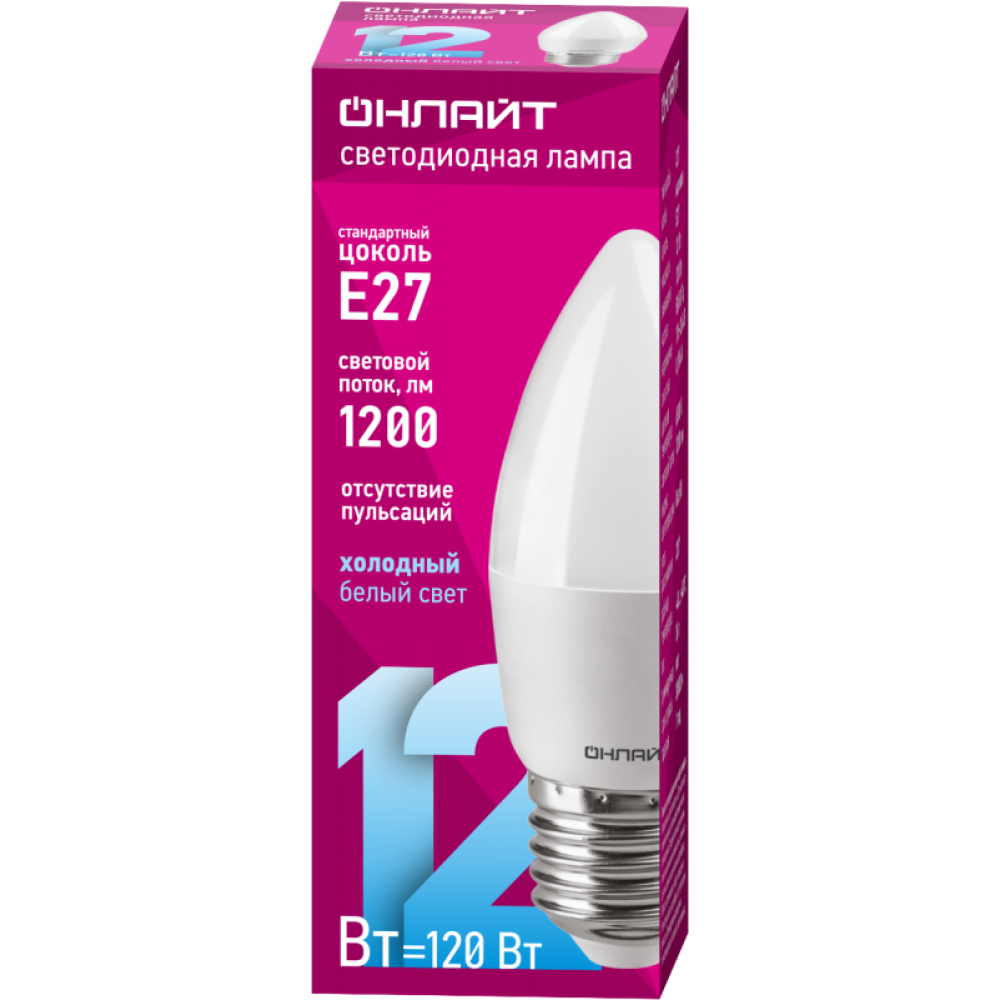 Технические характеристики Лампа светодиодная 90 059 OLL-C37-12-230-6.5K-E27-FR 12Вт свеча 6500К холод. бел. E27 1200лм 176-264В ОНЛАЙТ 90059