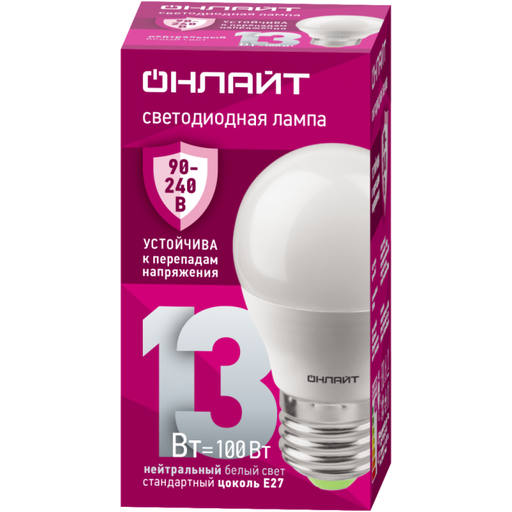 Технические характеристики Лампа светодиодная 90 427 OLL-G45-13-230-4K-E27-FR 13Вт шар 4000К E27 90-240В PRO ОНЛАЙТ 90427