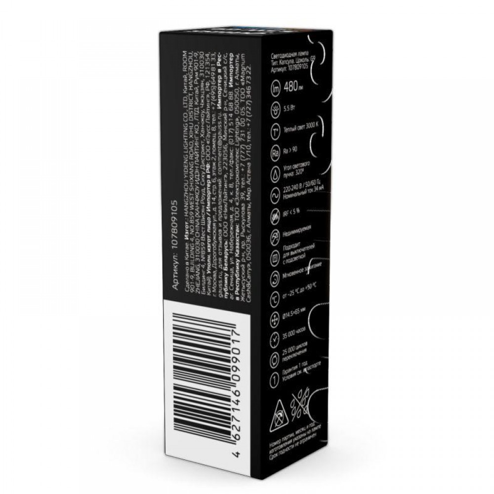 Технические характеристики Лампа светодиодная Black 5.5Вт капсульная 3000К тепл. бел. G9 480лм стекло GAUSS 107809105
