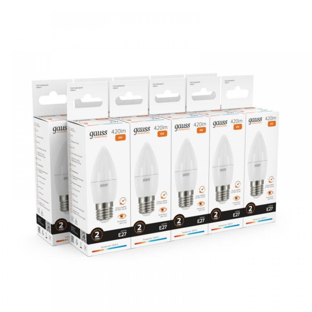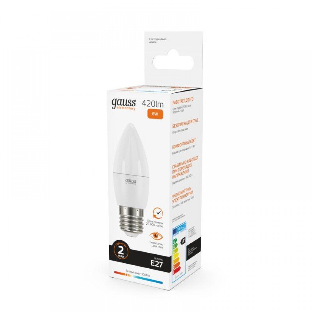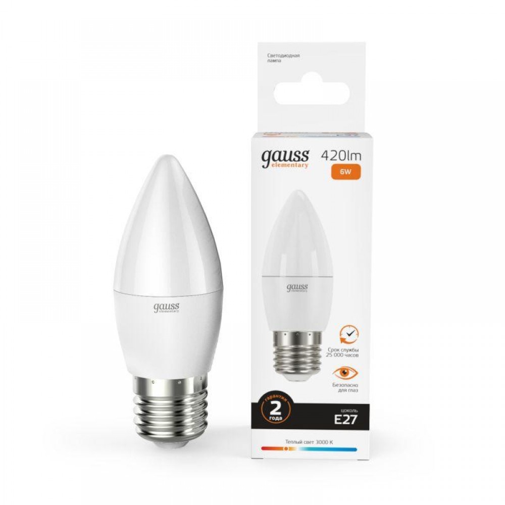 Лампа светодиодная Elementary 6Вт свеча 3000К тепл. бел. E27 420лм GAUSS 33216 0 0 ₽